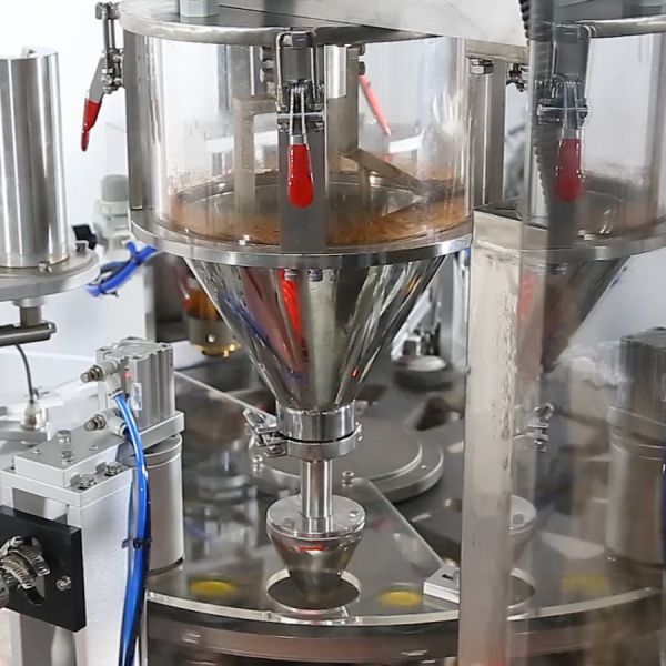 This is a high speed disc coffee capsule filling sealer. It is the first high-speed disc coffee filling sealing packaging machine in China. The maximum speed is 50 times per minute. At the same time, cooperate with the advanced electrical appliances, appearance and safety design, to achieve the domestic first-class level.